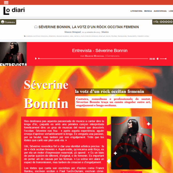 ACTUALITE FRANCE 3 ICI 19/20 - Langues minorisées régionales aux rencontres d'Astaffort - 05/10/2025 Festival FESTICOT - Maurens-Scopont - 04/10/2025 Lo diari : Séverine Bonnin, la votz d’un ròck occitan femenin - 19/09/2025 Concert Chapelle des Carmélites - Toulouse - 12/09/2025 Concert Chapelle des Carmélites - Toulouse - 12/09/2025 Concert Loures-Barousse - 02/08/2025 Concerts 2025 Festi Lingue Festival des langues et musiques régionales en Corse - 27 & 28 juin 2025 Le rock occitan féminin classé 3ème au concours européen des langues régionales et minoritaires - 27/11/2024 France 3 - ICI 19/20 - Edicion Occitana Liet iinternational 2024 - 24/11/2024 Séverine Bonnin : "Catarsis" - Occitan - Liet 2024 - 22/11/2024 "CATARSIS" sélectionnée au Liet International 2024 en Corse - 22/11/24 LA DEPECHE "Le rock occitan au fémininau festival Escambis" - 15/05/24 CONCERT SAINT-CÉRÉ - 24/05/2024 LA DEPECHE DU MIDI "Séverine Bonnin fait zwinguer le rock occitan" - 14/03/24 CONCERT DRÉMIL LAFAGE - 16/03/2024 INTERVIEW "Ràdio Lenga d’Òc" - 12/02/2024 PRÈMI DE LA CANÇON OCCITANIA 2024 CONCERTS PRINTEMPS 2024 INTERVIEW "France Bleu" - 19/11/2023 INTERVIEW "Ràdio Lenga d’Òc" - 26/10/2023 EMISSION FRANCE 3 ICI 19/20 - EDICION OCCITANA CONCERT AU FESTIVAL OCCITANIA - 07/10/2023 SORTIE DE L'ALBUM "FLAMA DE LIBERTAT" - 28/09/2023 ENTREVISTA RADIO OCCITANIA - 20/09/2023 SORTIE DU CLIP "FUÒC EN GABIA" - 14/09/2023 SORTIE DU SINGLE "FUÒC EN GABIA" - 14/09/2023 REALISATION DU PROCHAIN CLIP - 06/05/2023 LA DEPECHE "Varennes. Théâtre en langue d’Oc, succès auprès du public" - 15/04/2023 EMISSION FRANCE 3 "VIURE AL PAÍS" CLIP CATARSIS - 05/03/2023 ENREGISTREMENT DU NOUVEL ALBUM - 01/02/2023 RECLAMS (REVUE N°865) OCT. NOV. DEC. 2022 SORTIE DU CLIP CATARSIS - 15/12/2022 FESTIVAL OCCITAN TARATAT'òc - 19/11/2022 Podcast de Mireia Baeta Ferrer - 10/2022 INTERVIEW "Ràdio Lenga d’Òc" - 08/09/2022 CONCERT A L'HOPITAL GARONNE - 30/09/2022 FIN DU TOURNAGE DU CLIP CATARSIS - 05/06/2022 CONCERT A VILLEFRANCHE DE ROUERGUE - 21/05/2022 JORNADA INTERNACIONALA DELS DRETS DE LA FEMNA - 06/03/2022 FRANCE 3 "UNA SERADA PER CELEBAR LAS FEMNAS" - 05/03/2022 RADIO OCCITANIA "LO MAG ESPECIAL" - 03/03/2022 INTERVIEW "Ràdio Lenga d’Òc" - 01/03/2022 LA DEPECHE DU MIDI "LA TRADITION FEMINISTE OCCITANE" - 02/03/22 ANNIVERSARI DE L'OSTAL D'OCCITANIA - 17/12/21 LA DEPECHE DU MIDI " UNE LANGUE DE ROCK ET D'HISTOIRE " - 22/04/2021 FRANCE BLEU "lo ròck occitan al femenin" - 04/04/2021 INTERVIEW FRANCE 3 - 30/01/2021 INTERVIEW "Ràdio Lenga d’Òc" - 29/01/2021 SORTIE DE L'ALBUM "UNA NOTA DE TU" - 19/01/2020 CONCERT HOPITAL GARONNE - 15/11/2018